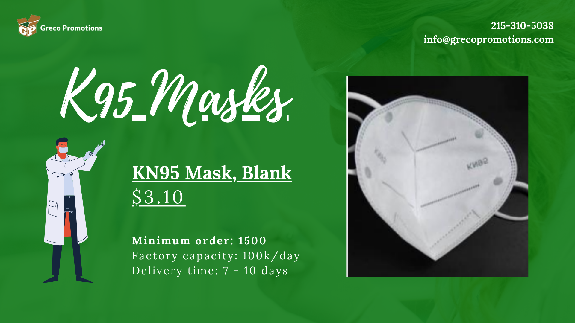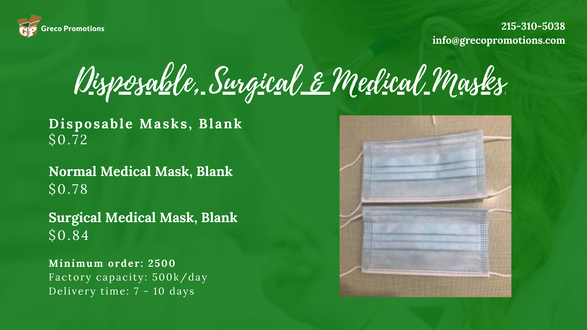 Please contact immediately Greco Promotions at 215-310-5038 or Email us at info@grecopromotions.com if you have a need for any of these products and we will work as expediently as possible to place your order and deliver your shipment.